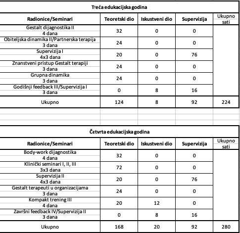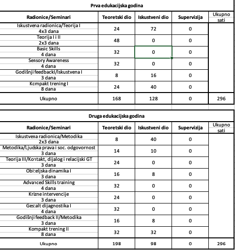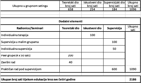 Uz spomenute sate pribraja se i 100 sati individualne terapije, 50 sati individualne supervizije, 100 sati supervizije u malim grupama i 600 sati supervizirane prakse koja podrazumijeva praktičan psihoterapijski rad sa klijentima, pod supervizijom (najmanje 8 zaključenih terapijskih procesa). U ukupan broj sati edukacije se priznaje i 40 sati za izradu završnog rada.
